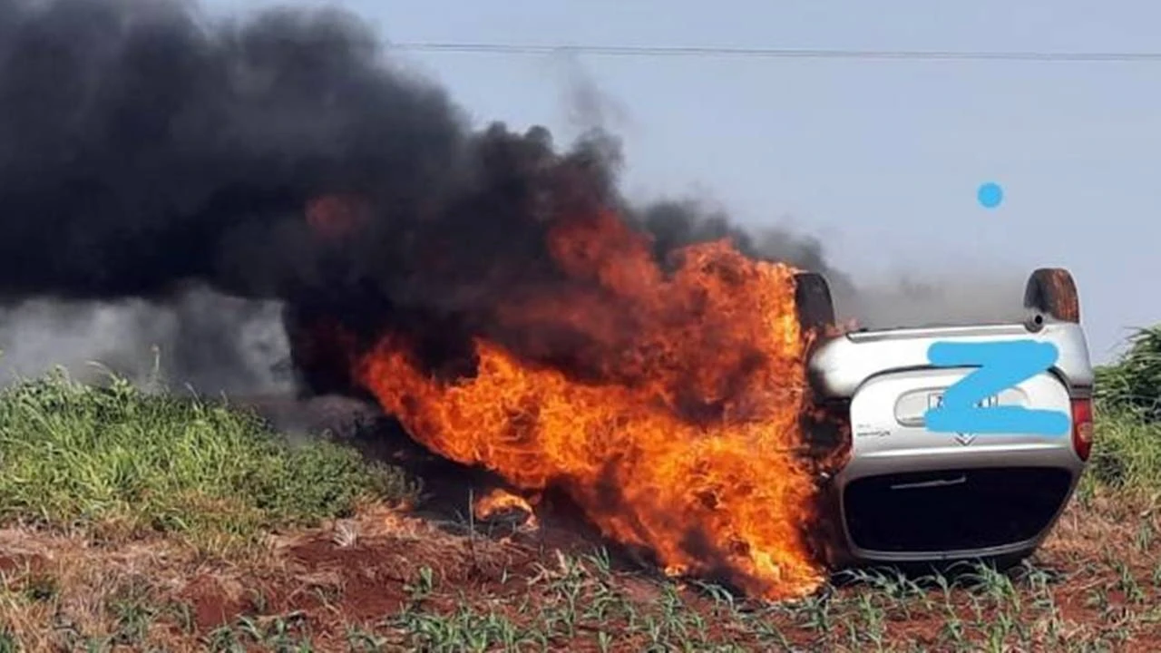 Em Patrulhamento, Policia localiza veículo capotado em chamas na PR-488