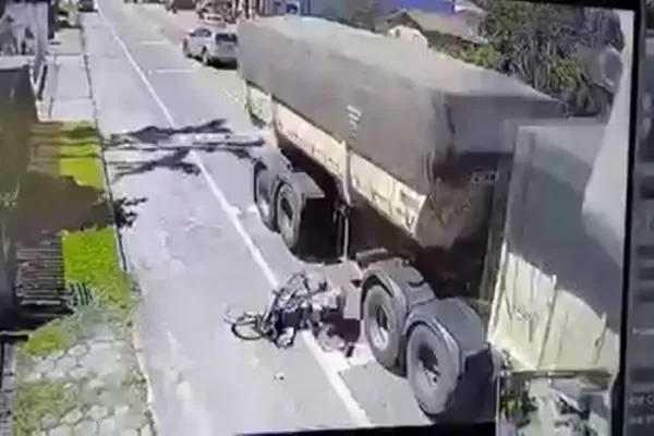 Com o choque, o ciclista caiu do veículo e bateu lateralmente nas rodas da primeira carreta. Na sequência, o homem foi atingido pelos últimos rodados do caminhão e empurrado para a lateral da pista, onde ficou caído.