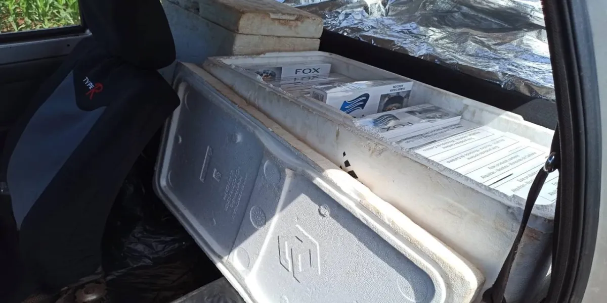 Os pacotes de cigarro estavam no porta-malas do veículo, encobertos por um papel alumínio. Também foram encontrados pacotes dentro de caixas térmicas, dissimulados como transporte de laticínios.