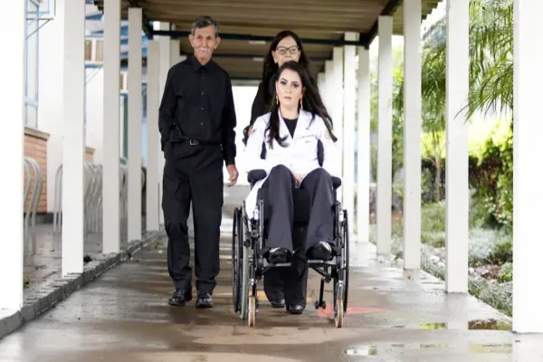 “A rotina dela é bem puxada, é fácil ver ela aqui na faculdade, mas só Deus sabe o que ela tem que fazer para estar aqui no horário. A gente tenta estar sempre no horário, mas é uma correria, porque ela tem aula, tem fisioterapia, terapia”, comenta a cuidadora Isabella Alves. “Ela é um combustível diário”.