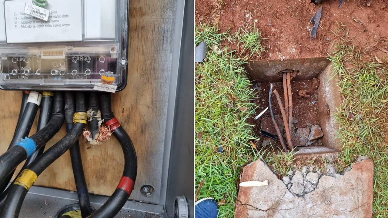 Foram levados diversos cabos da rede de alta tenção que passa por tubos subterrâneos, e parte que sai do relógio de luz.