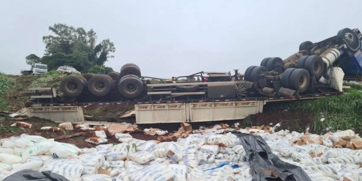 Uma carreta carregada com Açúcar tombou na manhã desta terça-feira pro volta das 09h30 na BR369 no KM487 nas proximidades do distrito de Nossa Senhora da Penha em Corbélia. Após o acidente o veículo parou as margens da pista.