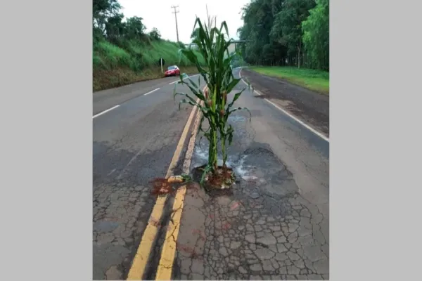 Indignado com os buracos na pista, um trabalhador, usuário da rodovia PR-491 que liga os municípios de Nova Santa Rosa a Marechal Rondon registrou na manhã de hoje pés de milho plantado nos buracos no meio da pista, nas proximidades da fecularia da Agícola Horizonte.