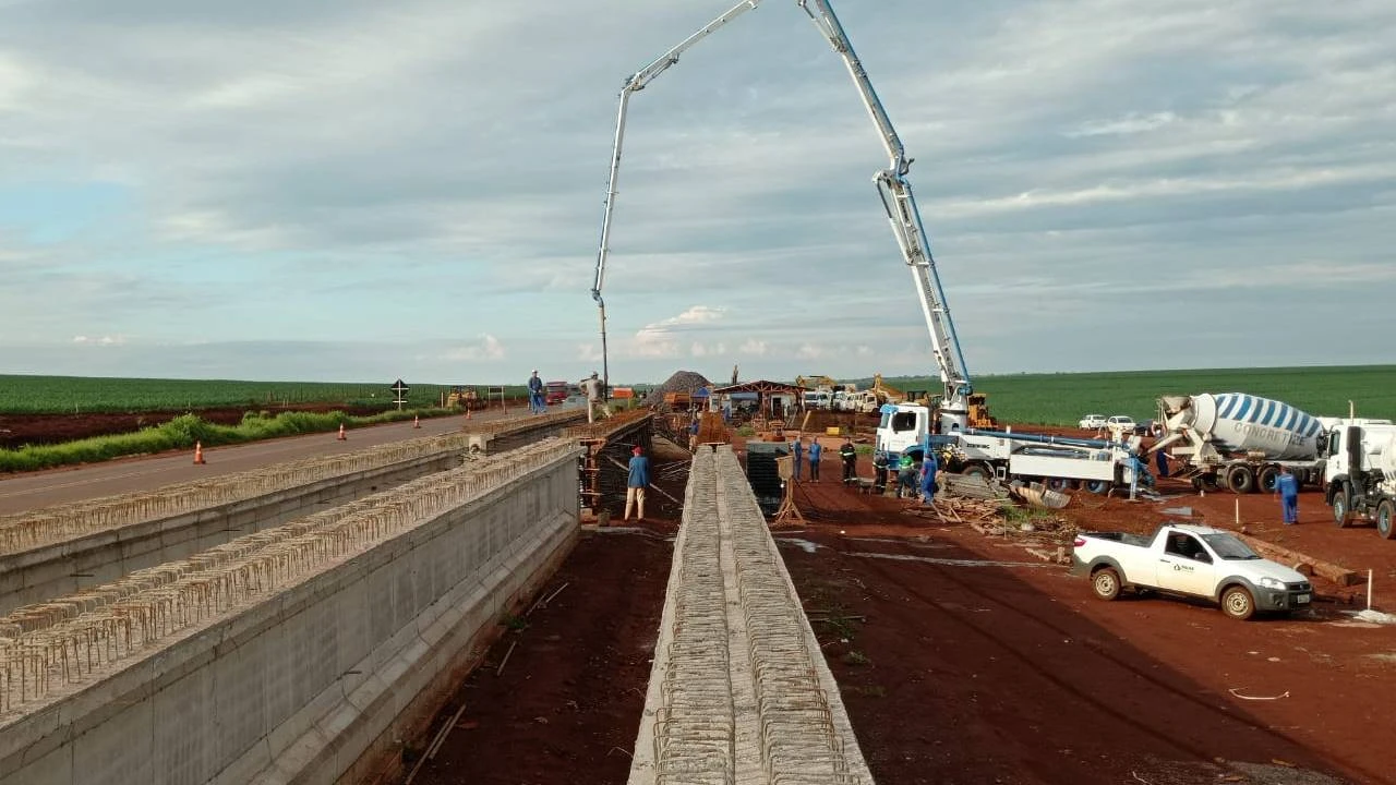 O viaduto que fará a ligação com a nova rodovia de acesso também será de concreto armado, passando por cima da BR-163, com extensão de 41,60 metros e largura de 16,20 metros, tendo duas pistas de 3,60 metros cada, acostamentos de 2 metros, barreiras de concreto New Jersey, passeios para pedestres e guarda-corpos. Estão sendo feitos os serviços de contenção, fundações, pilares e travessas, com as vigas já concluídas e, em breve, iniciando as lajes do tabuleiro do viaduto.