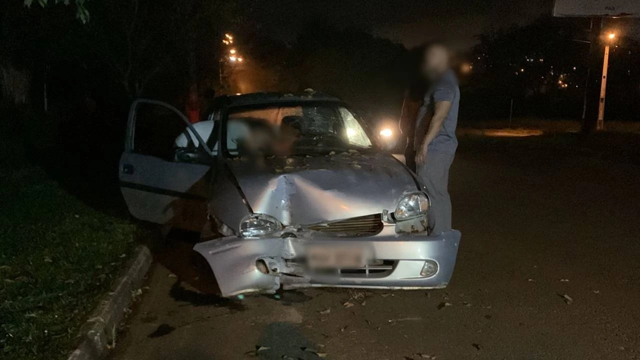 Um carro colidiu violentamente em uma arvore na noite deste sábado (23), no Loteamento Belmonte em Cascavel.