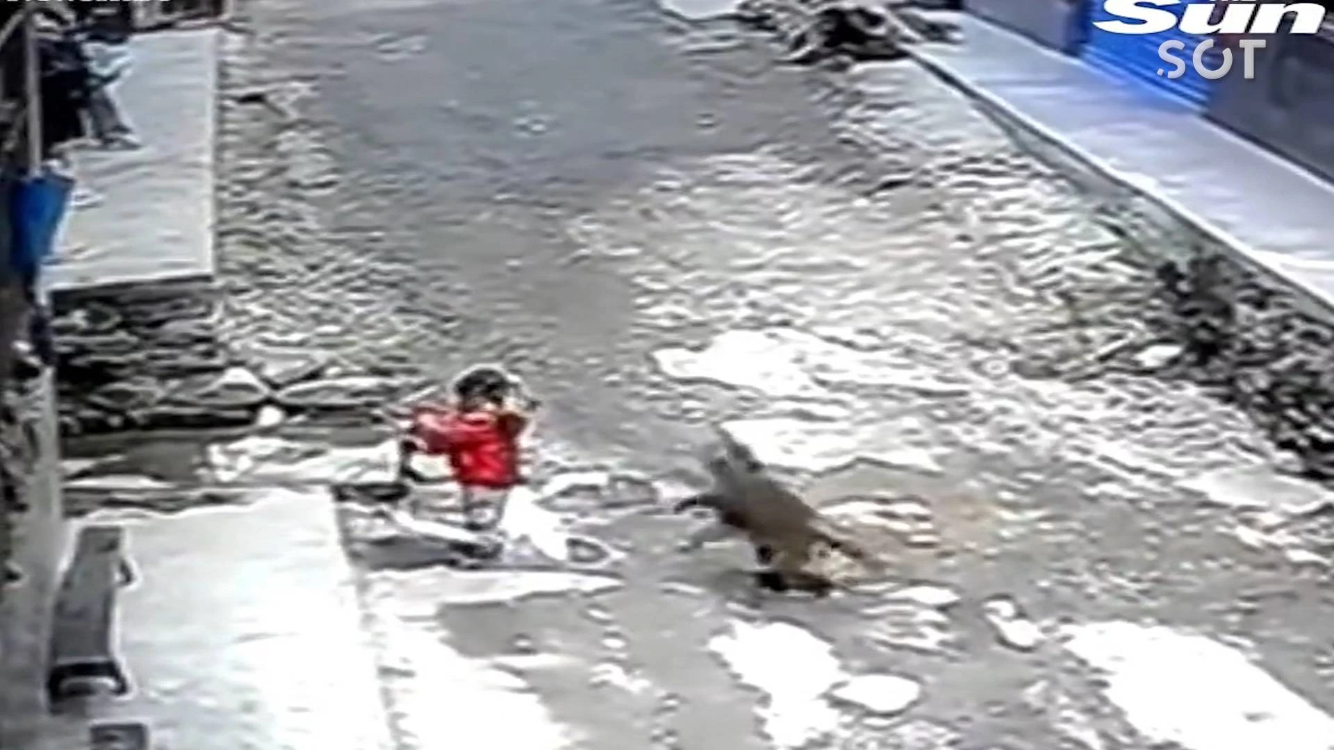 Uma câmera de segurança registrou o momento em que a criança estava andando carregando seu patinete e foi agarrada pelas costas, derrubada no chão e arrastada pelo animal. Uma pessoa que estava presente, viu o que estava acontecendo e, rapidamente, correu para resgatá-la. Confira o vídeo abaixo.