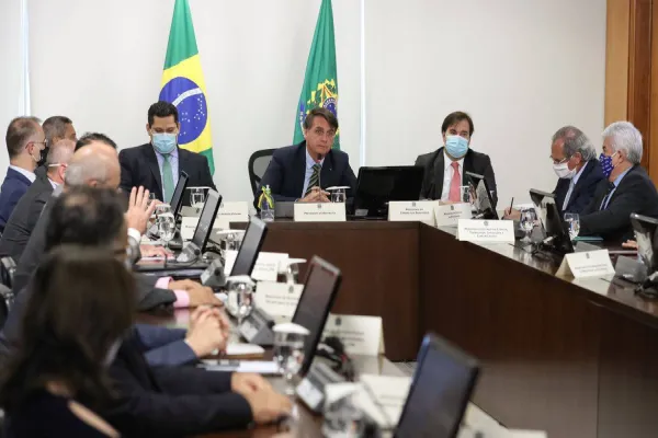 Os presidentes da Câmara dos Deputados, Rodrigo Maia (DEM-RJ), e do Senado, Davi Alcolumbre (DEM-AP), também participaram do encontro, ao lado de Bolsonaro e de ministros de Estado, a partir do Palácio do Planalto.