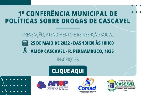 O Município de Cascavel, por meio da Secretaria Especializada em Cidadania, de Proteção à Mulher e Políticas sobre Drogas (SESD) e do Conselho Municipal de Políticas Públicas sobre Drogas(COMAD) realizam dia 25 de maio a 1ª Conferência Municipal de Políticas Públicas sobre Drogas.