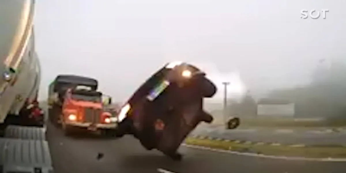 Como mostra o vídeo, filmado por quatro ângulos diferentes (frente, cabine e traseiras direita e esquerda), o motorista de um dos caminhões envolvidos dirigia normalmente pela rodovia pouco depois das 7h10 da manhã, quando foi surpreendido por um carro que veio pela direção contrária capotando pela pista.