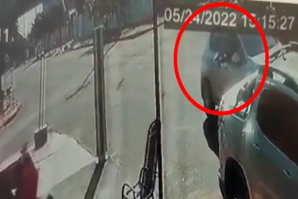 Uma câmera de segurança registrou o momento exato em que o carro prata passa pelo local e o passageiro dispara contra os populares que estavam em frente ao comercio.