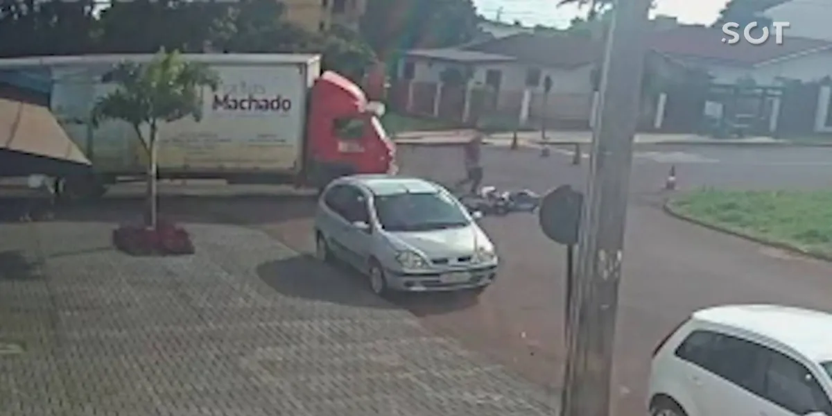 Nas imagens é possível ver o momento exato da batida, aonde o motociclista seguia pela Rua Paraná e quando ao se aproximar do cruzamento com a Rua Flamboyant, acabou sendo atingido por um caminhão que acessava a transversal.