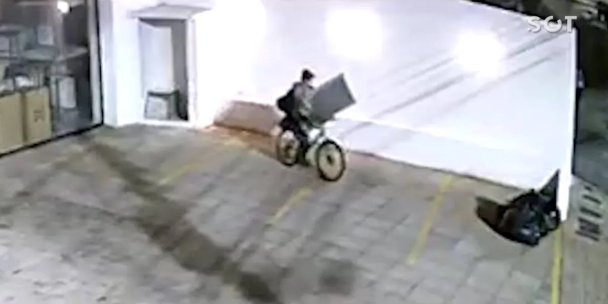 Toda a ação foi registrada por câmeras de segurança, aonde é possível ver um indivíduo se aproximando do comércio de bicicleta, para ao lado das portas e remove as mesmas rapidamente e sai do local.