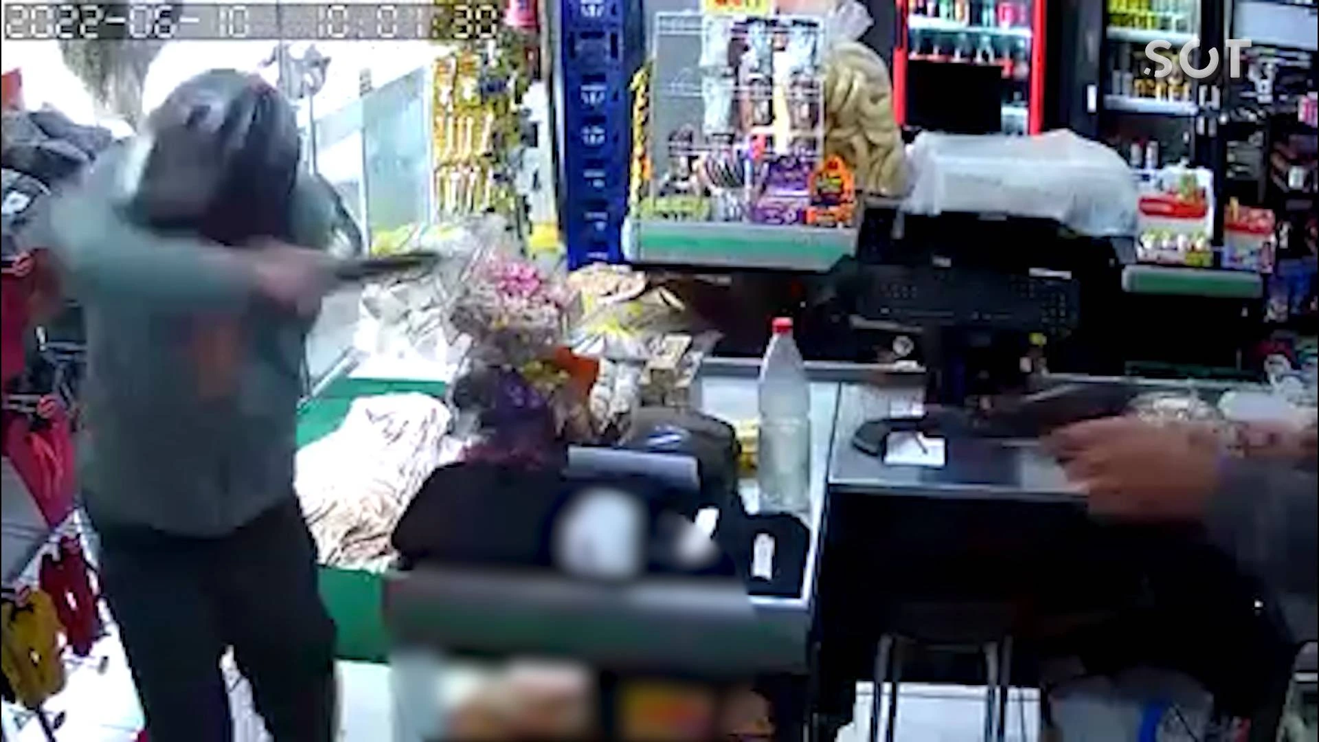 Na hora do fato, havia uma senhora no caixa, que é ameaça e levada para traz do móvel, momento em que o proprietário do mercado reage e atira contra o assaltante.