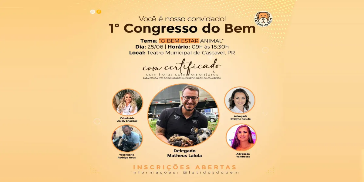 O evento - Políticas públicas e violência contra animais fazem parte dos temas que serão discutidos na 1ª Conferência do Bem, que acontece neste sábado (25), no Teatro Sefrin Filho, em Cascavel, das 09h às 18h. As inscrições são abertas ao público. O custo é de R$ 20,00 ou 2 kg de ração. O evento é promovido pela ONG Latidos do Bem.