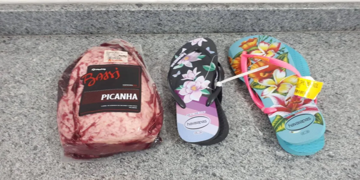 Seguranças aguardaram na porta do estabelecimento e após saírem sem pagar, abordaram e encontraram na bolsa dois pares de chinelos marca Havaianas e uma peça de carne picanha marca Bassi.