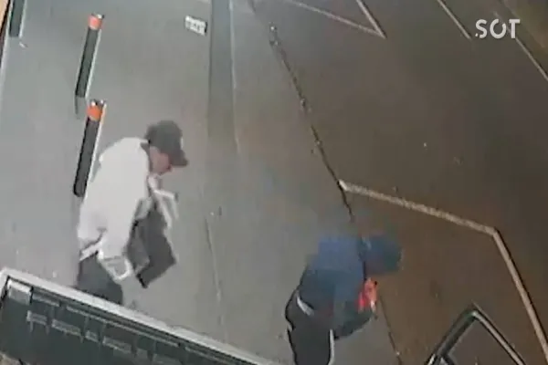 Rapidamente dois indivíduos entram no comércio, subtraem vários produtos. Na fuga, a S10 fica presa na porta e os meliantes largam o carro e fogem a pé.