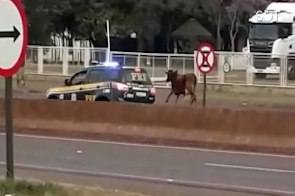 Perigo! Boi corre entre os carros na BR-277 e PRF escolta o animal para fora da via em Cascavel