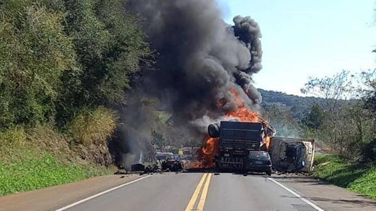 Segundo a Polícia Rodoviária Federal, dois caminhões tiveram uma colisão frontal. Além disso, a ocorrência ainda contou com um incêndio nos veículos.