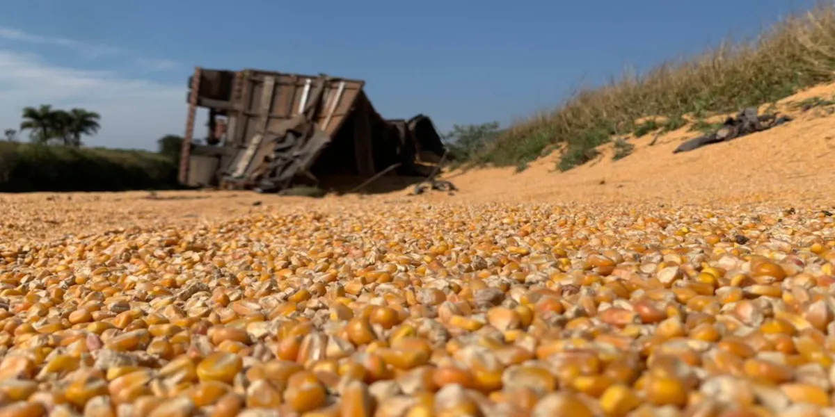 Caminhão carregado com milho tomba na BR-467 no distrito de Sede Alvorada em Cascavel