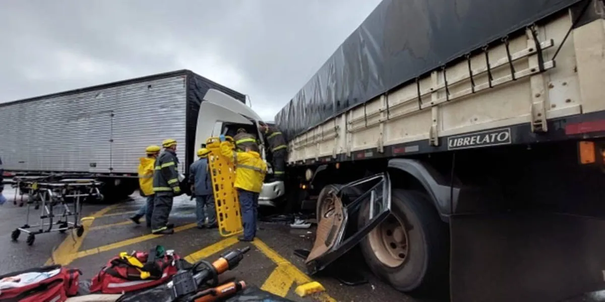 O motorista do caminhão de Pato Branco ficou encarcerado. Samu e Corpo de Bombeiros de Maravilha...