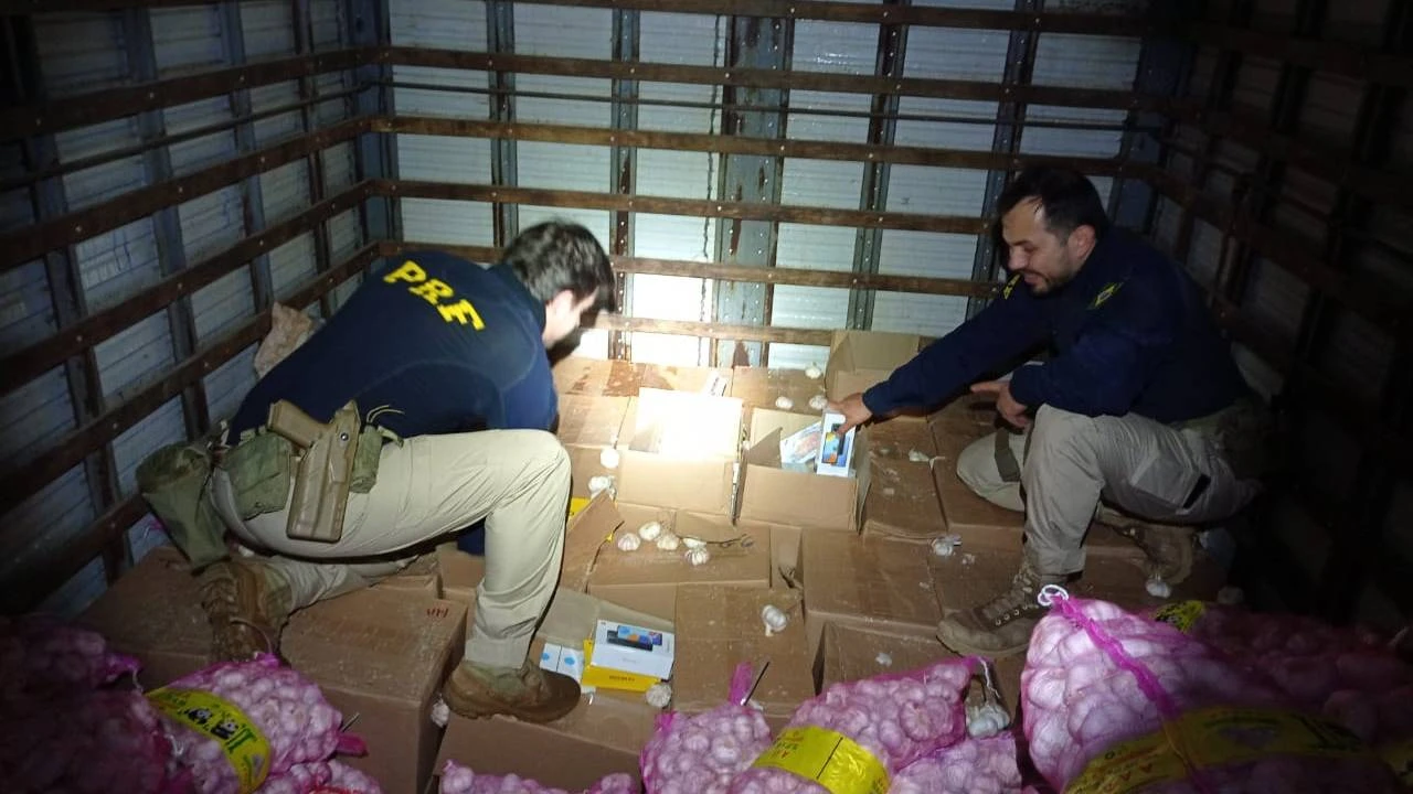 Ao fiscalizarem o compartimento de carga, sob uma camada de fardos de alho, os policiais encontraram os milhares de aparelhos eletrônicos sem o devido desembaraço aduaneiro.