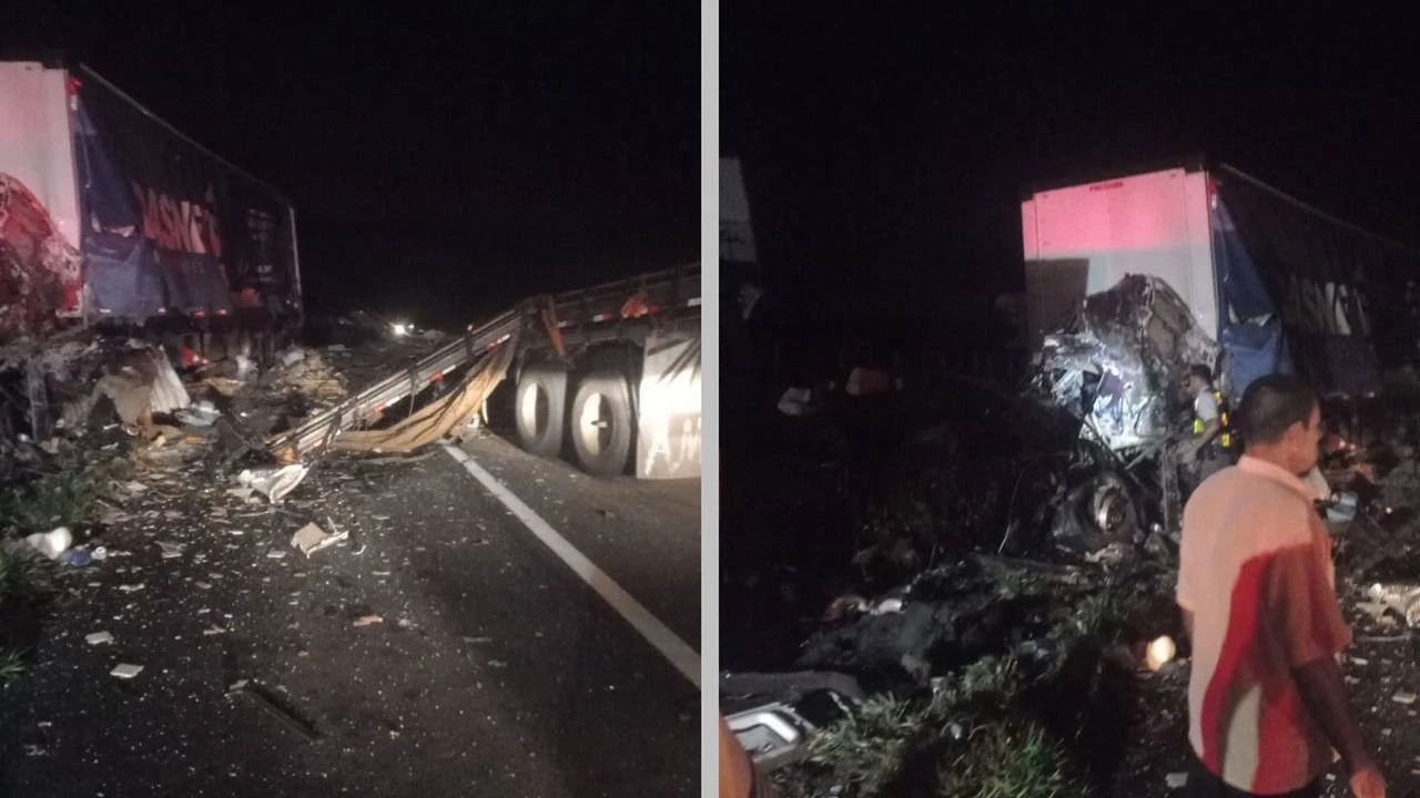 A colisão também envolveu um terceiro veículo. Esse carro foi atingido pela carga de piso de um dos caminhões após a colisão.