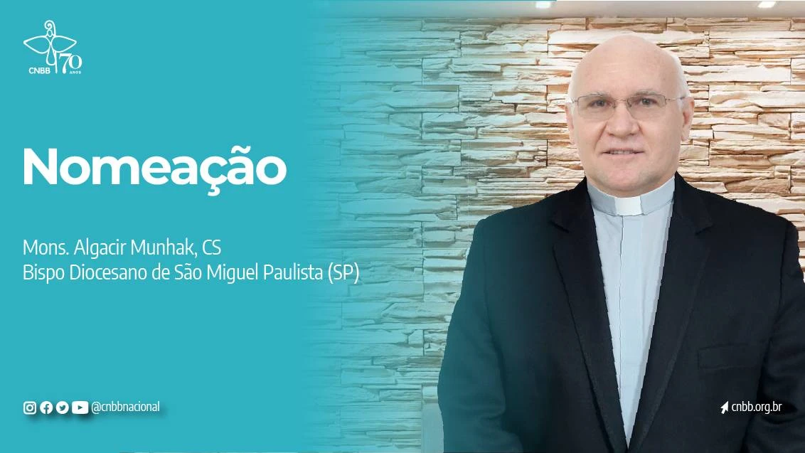 Biografia do novo bispo - Padre Algacir Munhak, nasceu em São João D´Oeste, distrito do município de Cascavel (PR), no dia 19 de abril de 1966. É o quinto filho de Albino Munhak (in memorian) e Joana Kroprochinski Munhak, tendo como irmãos Alésio, Otilindes, Marli, Geneci e Marislei. Em dezembro de 1979, fez o estágio vocacional em São Miguel do Iguaçu (PR), para, depois, ingressar no Seminário São Rafael, em Casca (RS), no dia 3 de março de 1980, na Congregação dos Missionários de São Carlos, Scalabrinianos.