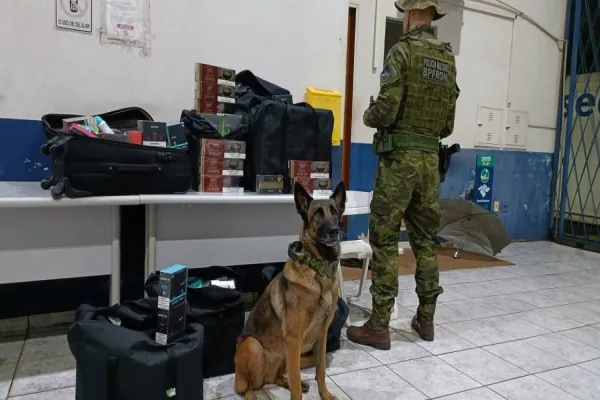 O cão farejador do canil do BPFRON indicou para as bagagens de um passageiro de 37 anos. Nas bagagens foram encontrados pacotes de cigarros contrabandeados, cigarros eletrônicos e essências. O contrabando foi encaminhado para a delegacia da Receita Federal em Cascavel-PR.