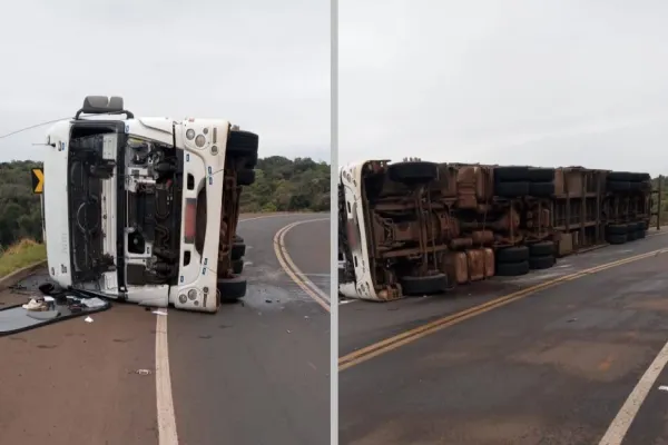 Uma carreta com placas Irani/SC tombou no viaduto que liga a BR-277 com a BR-373, em Candói, por volta das 7 horas desta quarta-feira (28). O local conhecido como “Curva do Viaduto” tem registro histórico de tombamentos de caminhões e carretas.