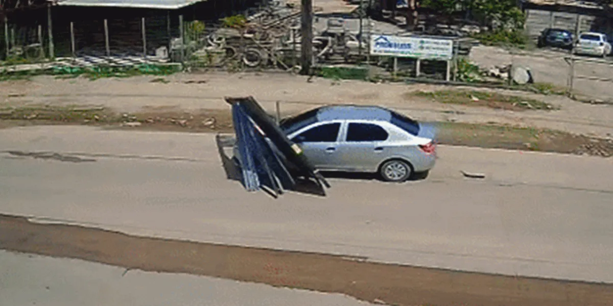 Câmeras de segurança registraram o momento da fuga. O carro aparece com o portão no capô, e as imagens mostram o motorista fazendo manobras com o veículo para tentar se livrar da peça.
