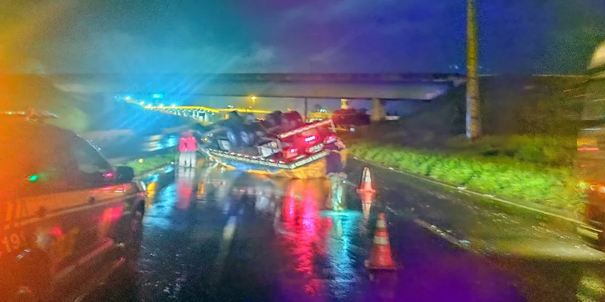 Na noite desta Quinta-Feira (20), a PRF atendeu uma saída de leito carrocavel, seguida de tombamento de um caminhão M.Benz/Atego com placas de Taquaritinga/SP, no km 497 da BR 376, em Ponta Grossa.
