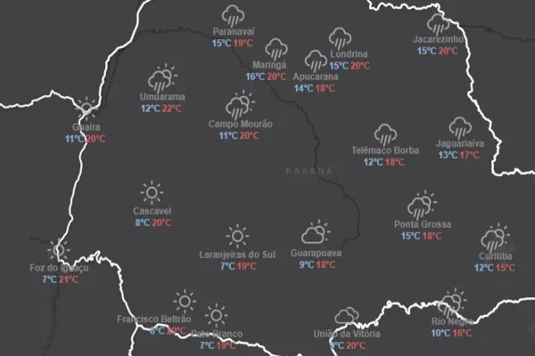 Em Cascavel as temperaturas variam mínima 8ºC e máxima 20ºC.