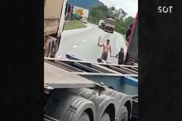 Ainda nas imagens, aparecem duas carretas atravessadas e interditando a pista. Após a confusão os condutores seguiram viagem. A PRF informou que não atendeu ocorrência.