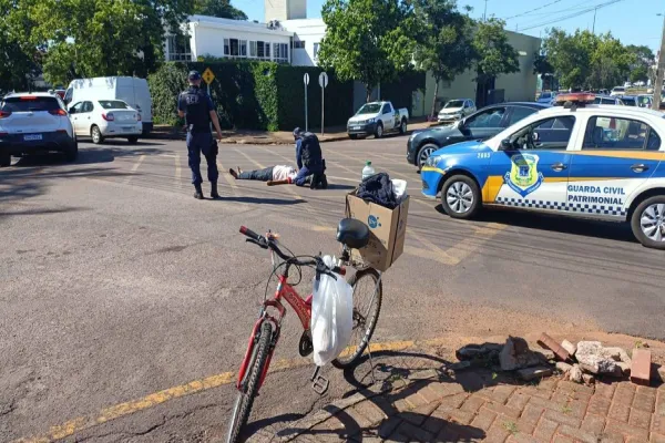 Agentes da Guarda Civil Patrimonial de Cascavel prestaram os primeiros socorros a uma mulher vítima de acidente na Rua Vitória, esquina com Uruguai, no bairro Alto Aegre, na manhã desta quarta-feira (26).