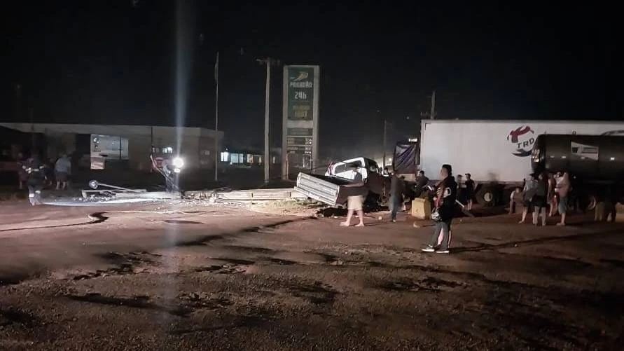 Caminhonete F1000 colide violentamente em poste ao tentar acessar posto de combustíveis na BR-277
