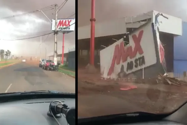 Impressionante: Vendaval derruba letreiro de supermercado e árvores no norte do Paraná