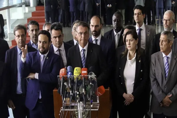 Bolsonaro apareceu, num púlpito previamente preparado, acompanhado por diversos ministros do seu governo e aliados políticos...
