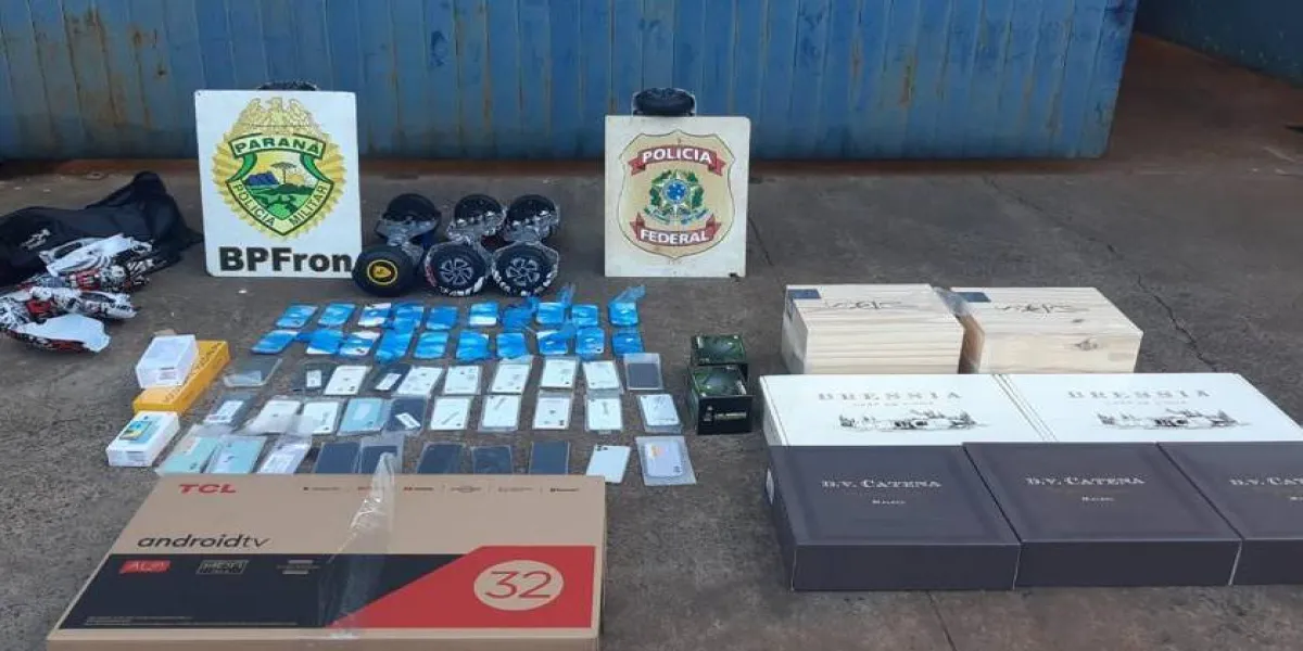Ao realizar a vistoria do local, os policiais localizaram um veículo com diversas mercadorias provenientes do Paraguai, dentre elas 50 celulares e 7 caixas de vinho. Os celulares foram encontrados escondidos dentro de brinquedos, como forma de dificultar a fiscalização.