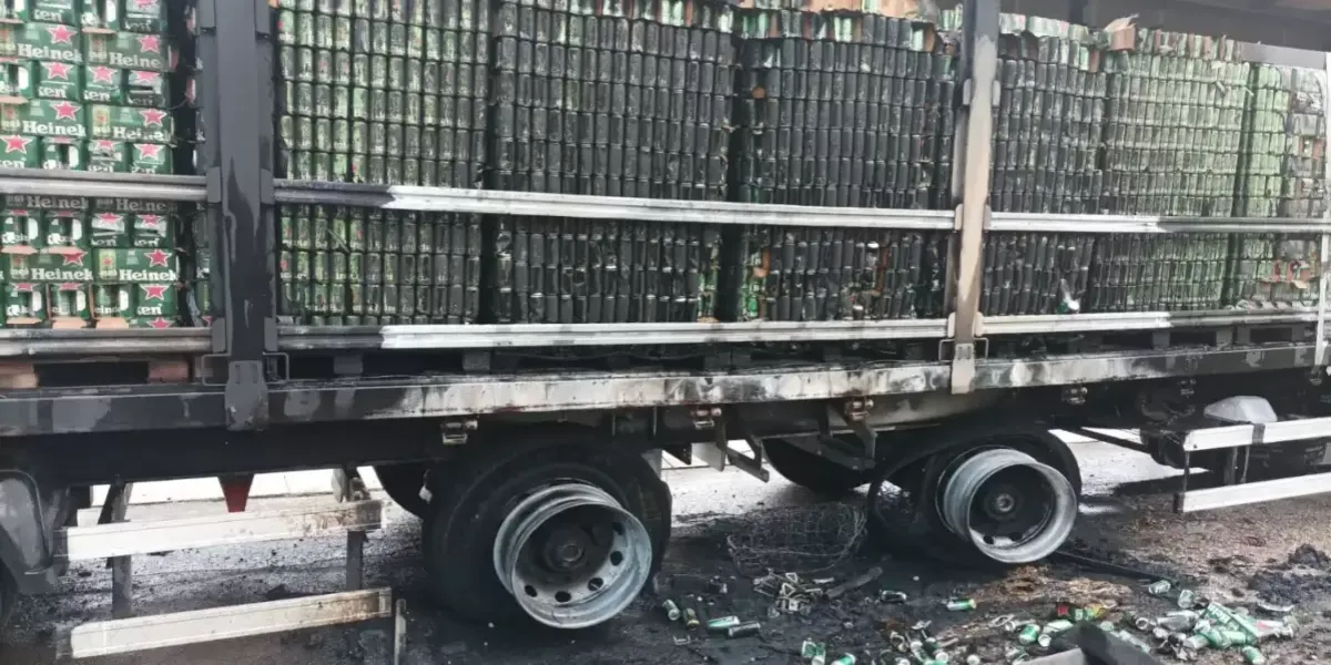 Um caminhão carregado de cerveja e guaraná teve parte da carga danificada após um princípio de incêndio no Contorno Sul, em Curitiba. Sem conseguir desviar, o motorista passou por cima de um colchão que estava jogado na pista.