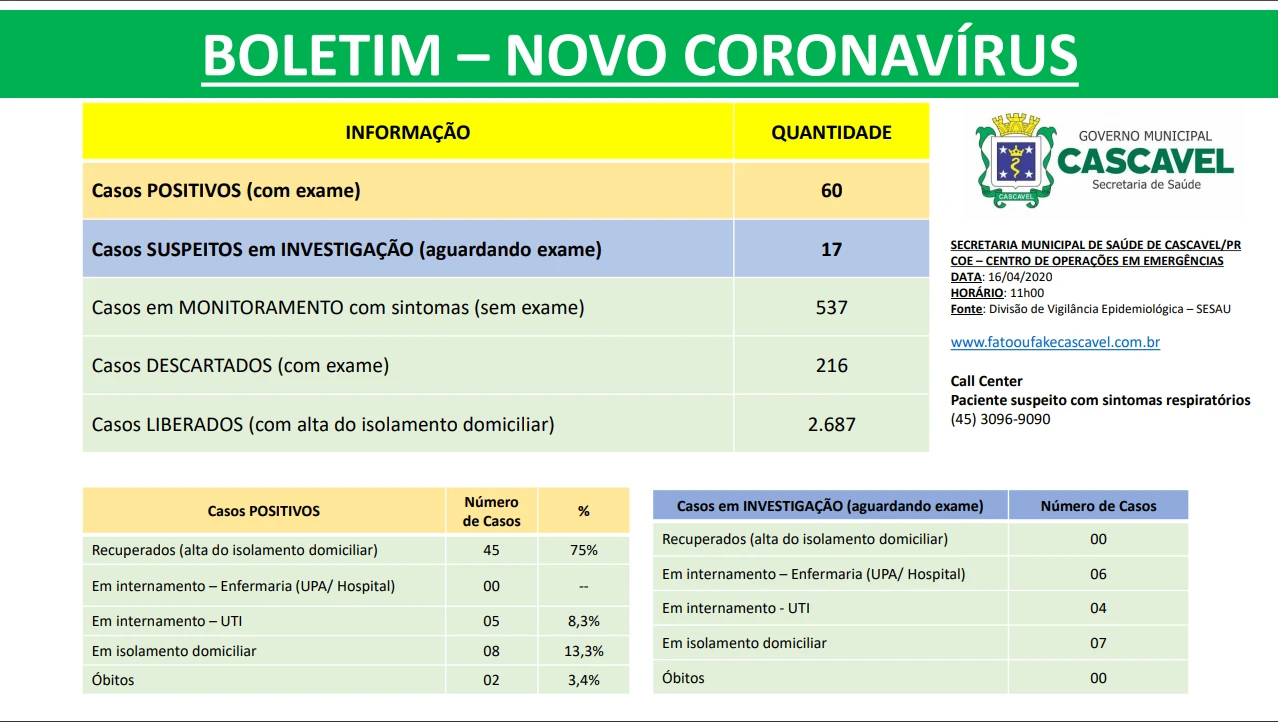 A Secretaria Municipal de Saúde divulga diariamente o boletim com as informações mais relevantes sobre os casos suspeitos e confirmados do novo coronavírus (Covid-19) em Cascavel.