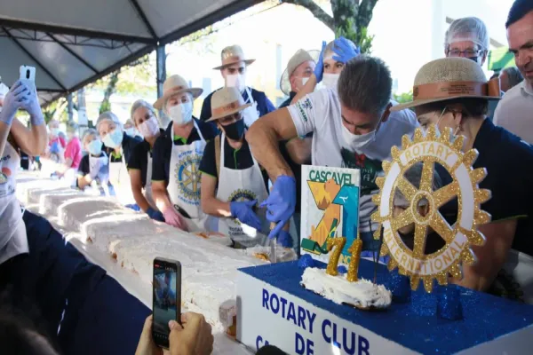 O bolo é feito por voluntários liderados pelo Rotary Clube Cascavel Leste. Janice Parizotto, presidente do clube de serviço, conta que a produção começou há dois meses com a doação dos ingredientes e a massa passou a ser preparada pela Panificadora Cristal, de forma gratuita, na quarta-feira da semana passada. Há 24 anos o Rotary confecciona o bolo.