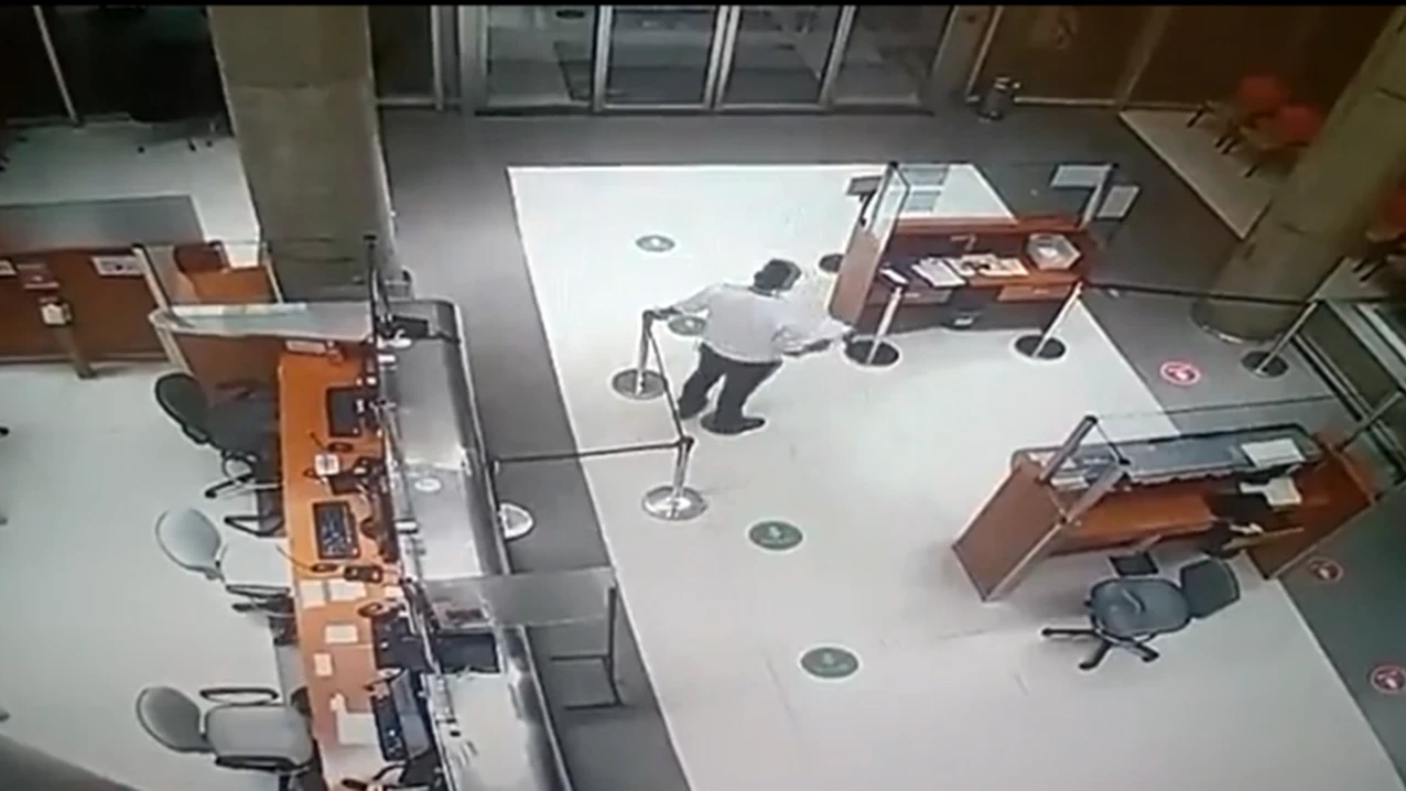 As câmeras de segurança registraram o momento em que a porta do hospital se abre e o segurança se levanta para conversar com alguém.