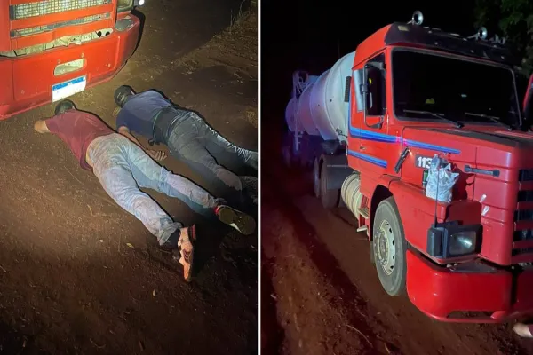Os policiais acompanhavam movimentação de veículos no local e perceberam que os suspeitos realizavam o transbordo de carga entre caminhonetes e uma carreta-tanque.
