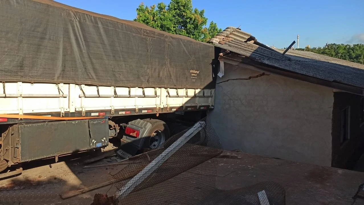 Carreta fica sem freios e invade residência e borracharia em Toledo