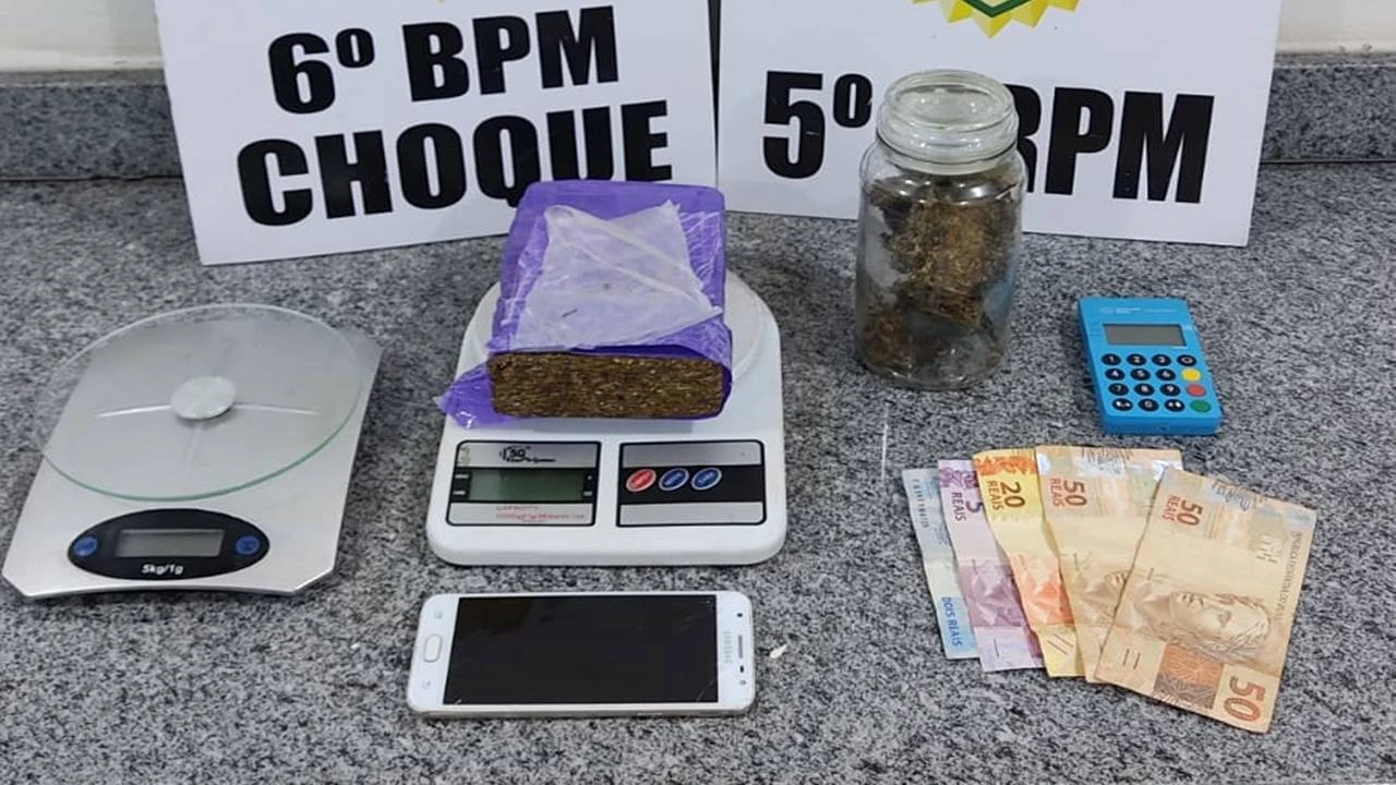 Após vigilância, demandou as equipes CHOQUE que realizaram a abordagem ao local sendo encontrado 682g de maconha, uma máquina de passar cartão, R$ 127,00 em espécie e duas balanças de precisão.