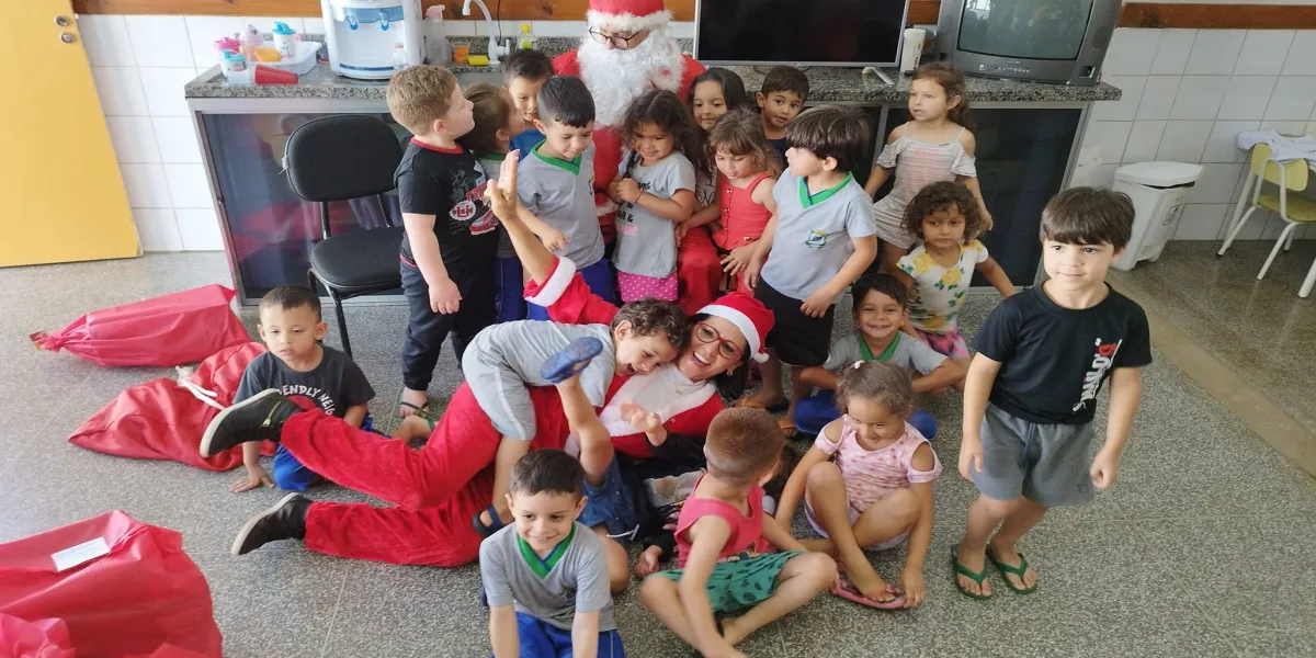 As crianças assistidas pelo CMEI Professora Gracinda Rocha, do bairro Interlagos, foram visitadas pelo Papai Noel e Mamãe Noel na tarde desta quinta-feira (15).