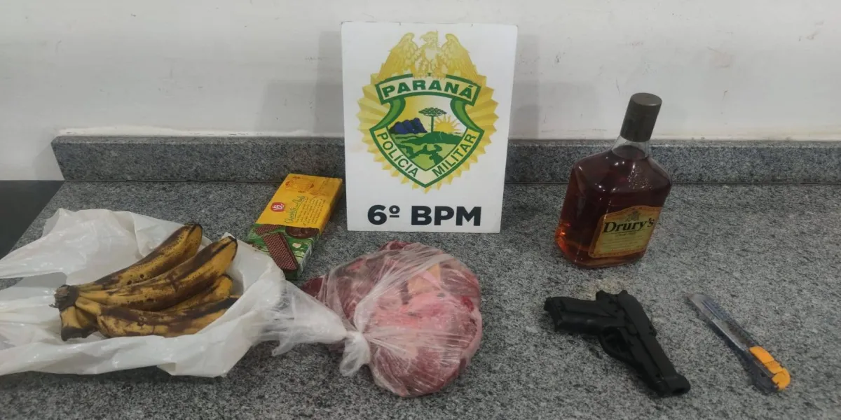 No local, dois homens e uma mulher foram flagrados furtando carne, banana, wafer e whisky do estabelecimento comercial. Ainda com os mesmos foi localizado um simulacro de pistola.