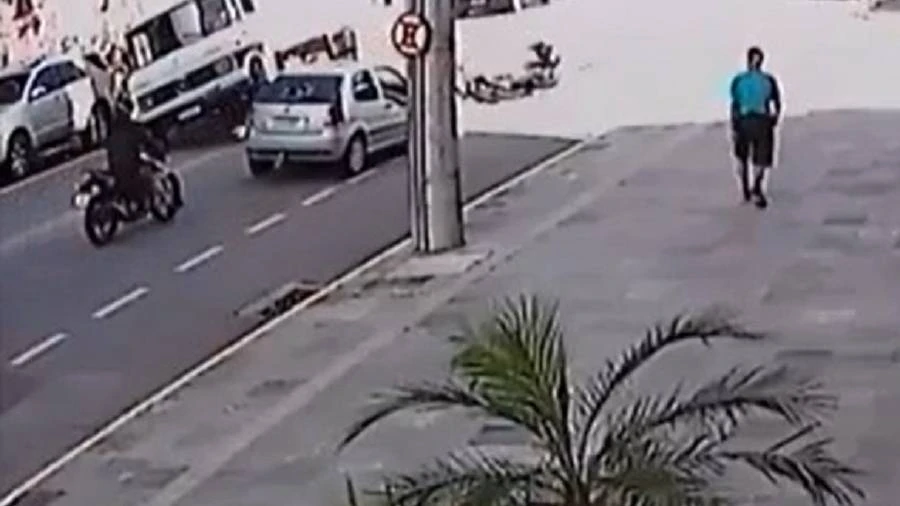 O acidente foi registrado por uma câmera de segurança. É possível ver o momento em que, com o choque, ele tomba sobre um motociclista, que quase é esmagado.
