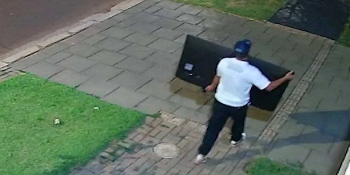 Nas imagens é possível ver toda a movimentação do crime. Dois homens chegaram ao imóvel, invadem rapidamente e furtam um aparelho televisor de 55 polegadas.