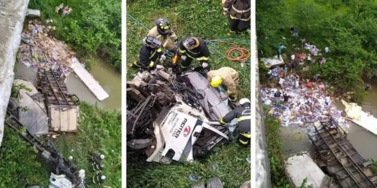 Motorista morre preso às ferragens após caminhão cair em rio; Populares saquearam a carga